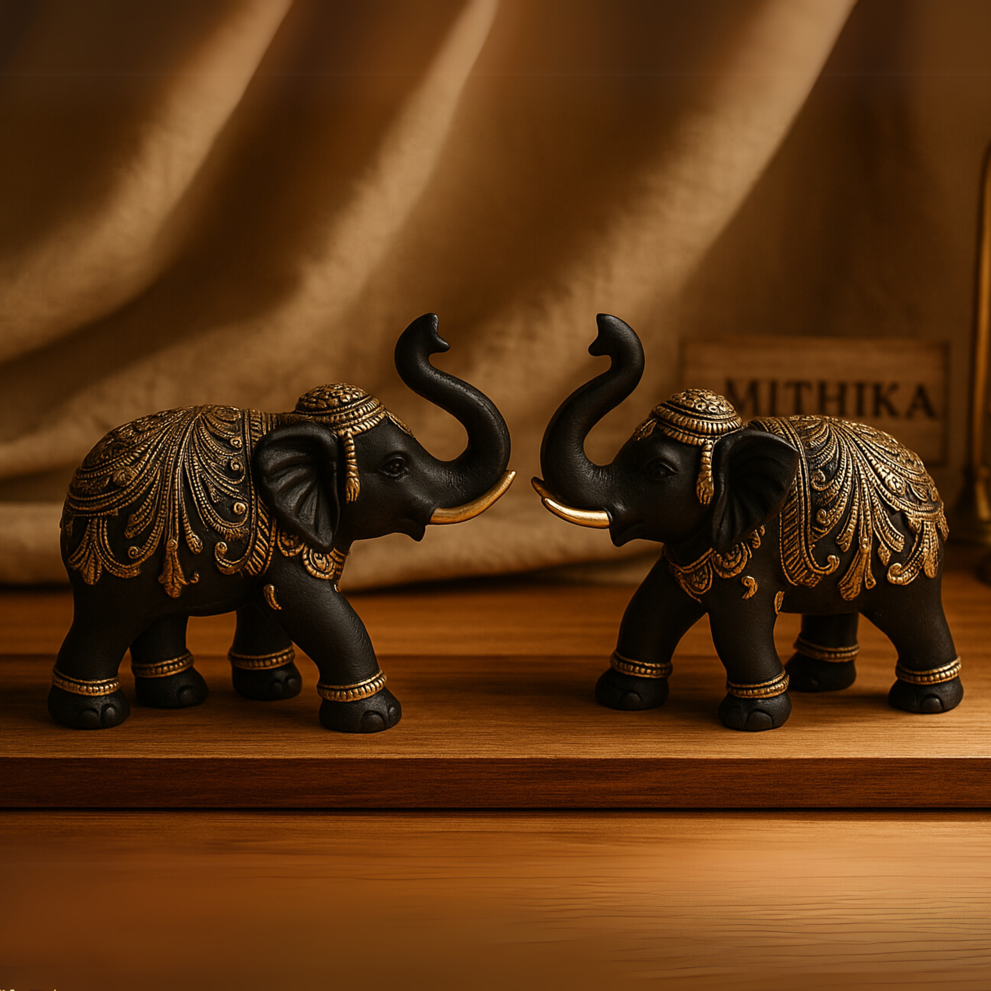 Regal Elephant Duo – Black & Gold Handcrafted Showpiece Set